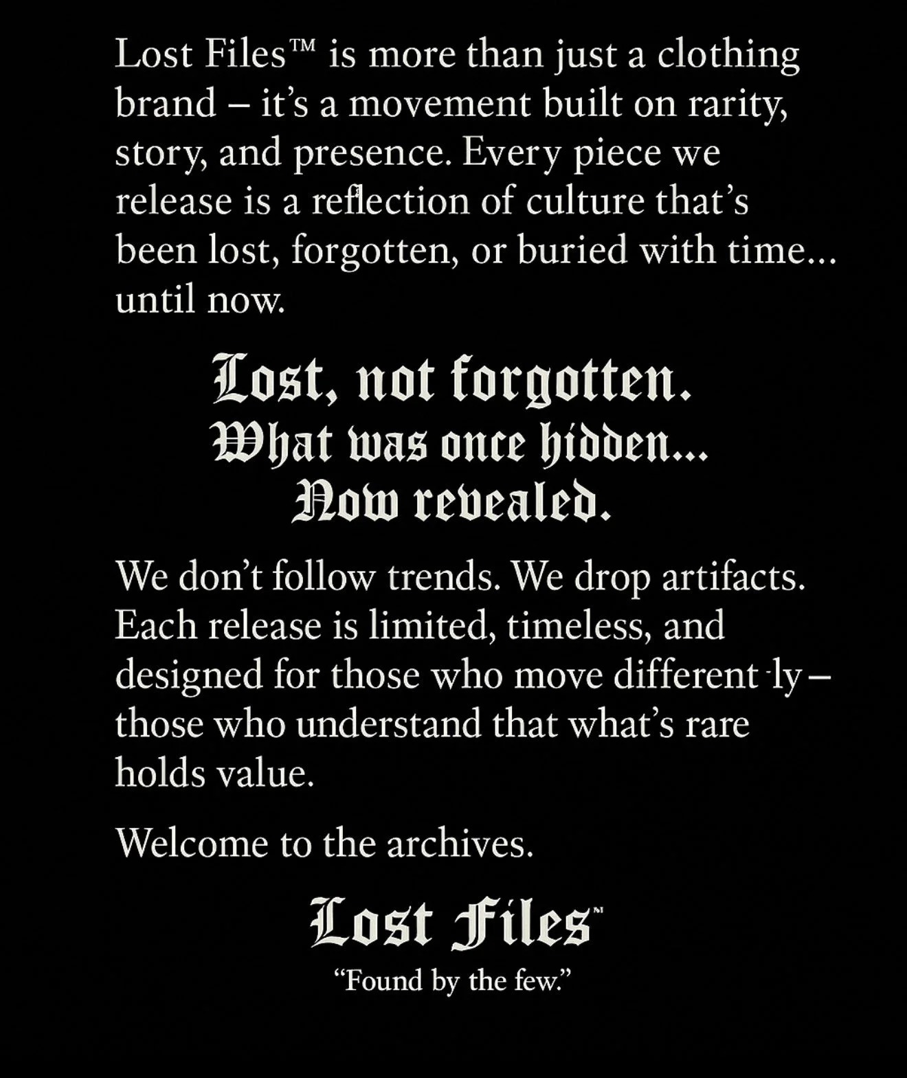 Black background with white text about Lost Files, describing the importance of rare and limited releases in a movement that values culture and artifacts, emphasizing that what is rare holds value and encouraging discovery in archives.